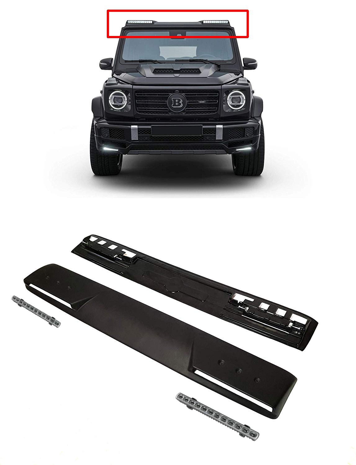 A masterpiece aggressive and sporty. Front roof spoiler led lights 2 wiring harness module for led lights. This part may be considered a special order if custom made low volume or not something we generally stock. G wagon 2019 brabus style front roof carbon spoiler with led drl for the new w463a w464 g class mercedes benz g63 g500 2018 models.