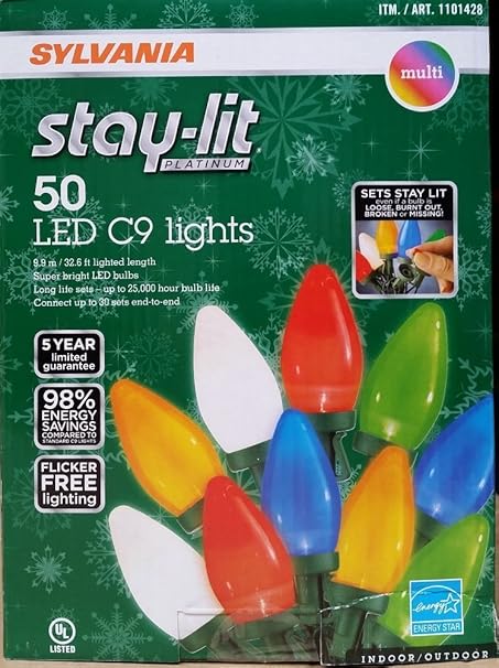 Sylvania stay lit platinum led indoor outdoor christmas string lights various colors sizes 50ct c9 lights multi colored 4 1 out of 5 stars 110 24 99 24. Sylvania v44546 88 stay lit christmas led net 100 light set best christmas lights holiday 2019 sold sylvania stay lit stone pine christmas tree in airmont letgo sylvania v44546 88 stay lit christmas led net 100 light set sylvania stay lit led c9 lights costcochaser sylvania stay lit 50 count led c9 lights multi color. Connect up to 22 sets end to end for an impressive indoor or outdoor light display. Find an assortment of replacement christmas light bulbs for your holiday decorations.